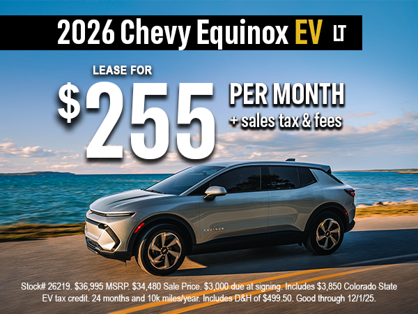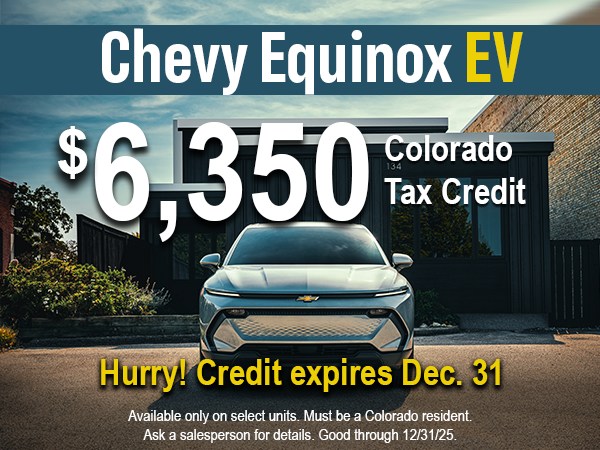 Don't miss a $6,350 Colorado tax credit on select Chevy Equinox EV. Hurry! Credit expires Dec. 31, 2025. Start shopping for your new Equinox EV.