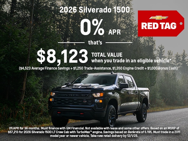 Red Tag specials have started at Dellenbach! Take advantage of 0% APR for 36 months on a new 2026 Silverado 1500 in Fort Collins. That means up to $8,123 in total value when you trade in an eligible vehicle! Start shopping for your new Silverado today!